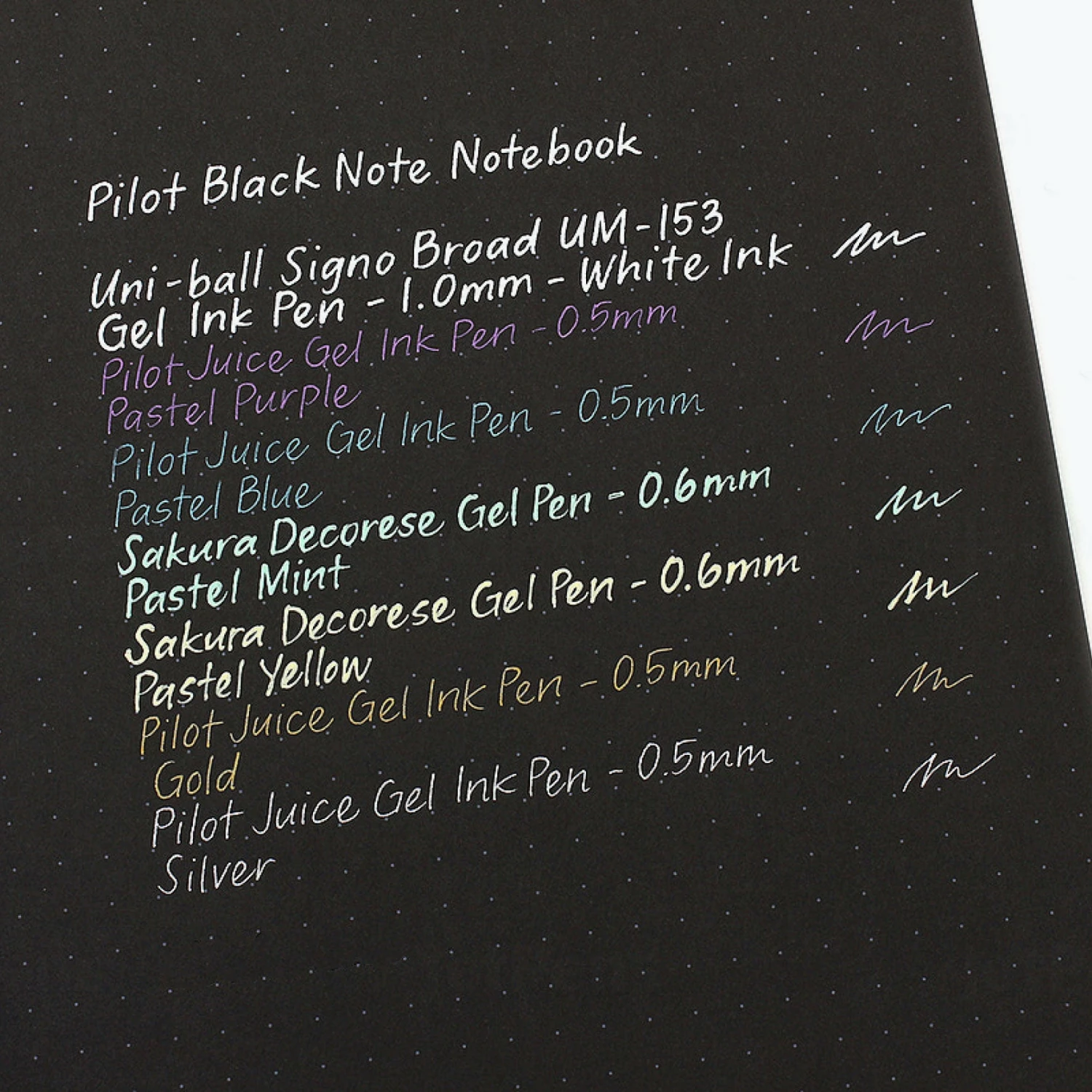 The notebook version is bound on the side and filled with high-quality, black paper to provide the perfect base for coloured pens. We recommend the Pilot Juice Up pens for writing in this notebook.Β