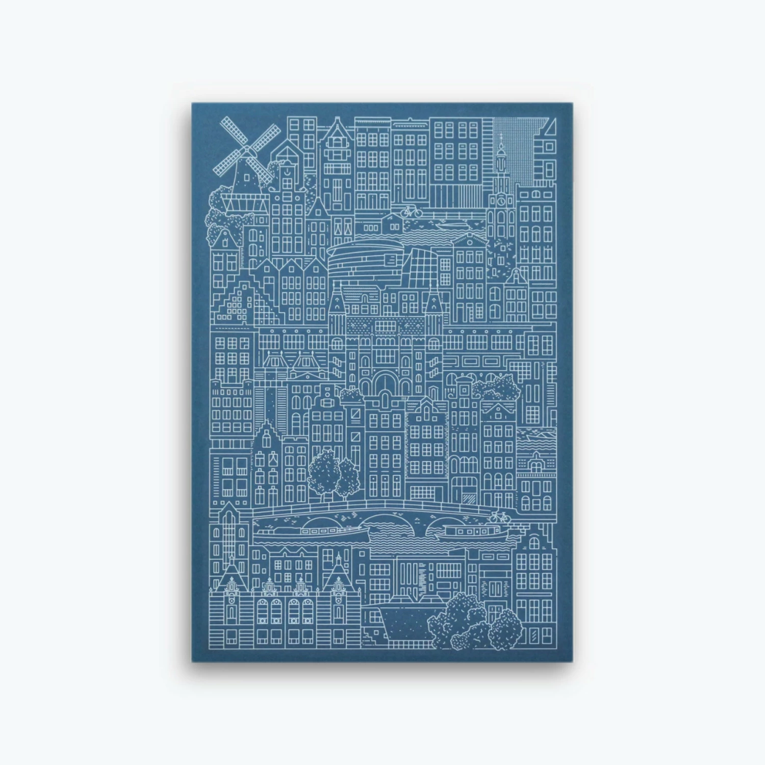 The charming canal city is inscribed into this high-quality notebook. The blue cover features iconic landmarks including the Rijksmuseum, Stedelijk Museum, Van Gogh Museum and De Gooyer Windmill β how many can you find?