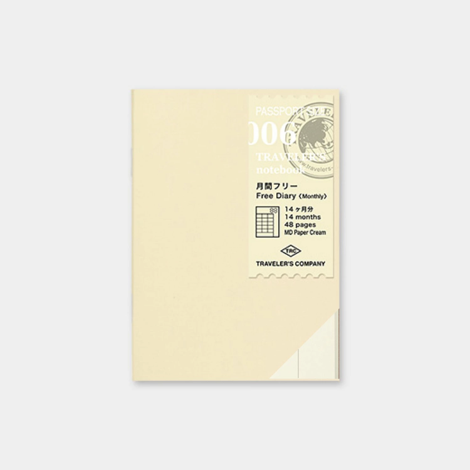 The 006 free diary (monthly) is an insert for the passport size Traveler’s Notebook and comes with 64 pages of MD Paper. The layout allows for a month to a double page spread, with enough pages for 14 months of the year. The insert also includes intro pages featuring an annual summary overview, a world map and blank pages for notes. The calendar pages are undated so you can start the planner at any time of the year.