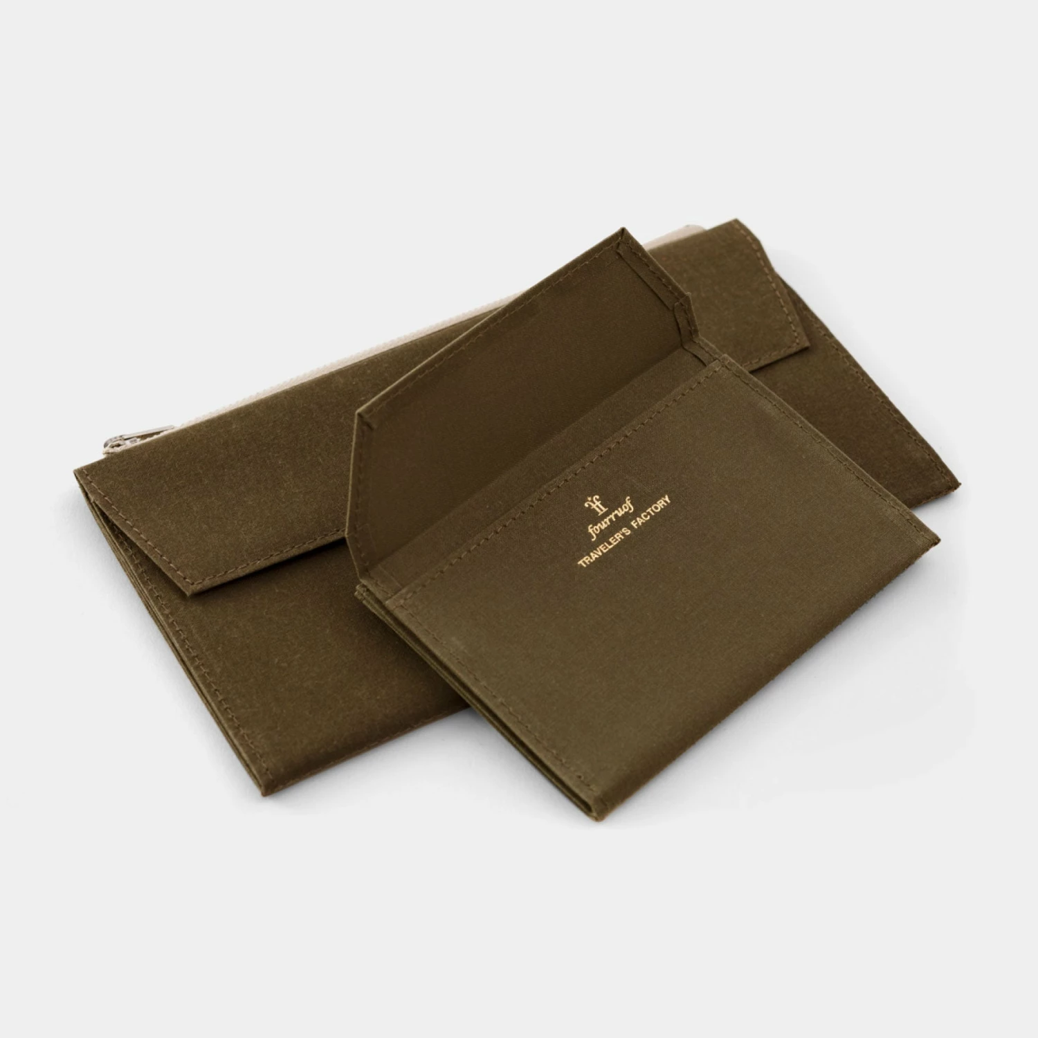 ThisΒ passportΒ sized,Β olive case has a zipper pocket that is perfect for storing money, keys or writing instruments, an envelope-style slip for carrying tickets and postcards and three small pockets for cards.